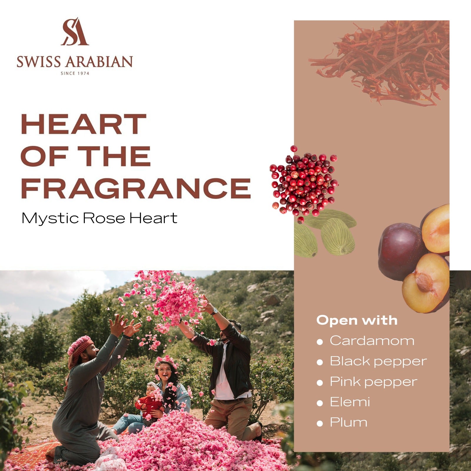 Enigma of Taif is a bold, rose fragrance that wraps the skin in sensual warmth. It opens with a vibrant rush of cardamom, black pepper, and pink pepper-spices that spark the senses-softened by the luscious depth of plum, adding a dark, fruity richness. At its heart lies the majestic Taif rose, blooming in full splendor. This rare floral is layered with golden saffron, soft violet, sacred olibanum, and the apricot glow of osmanthus-together creating a heart that is both regal and mysterious. As the scent settles, it deepens into a warm, smoky trail. Molasses brings a dark, syrupy sweetness, while vetiver and oakwood lend earthy structure. Amber and labdanum leave behind a long-lasting impression of quiet power and winter depth.