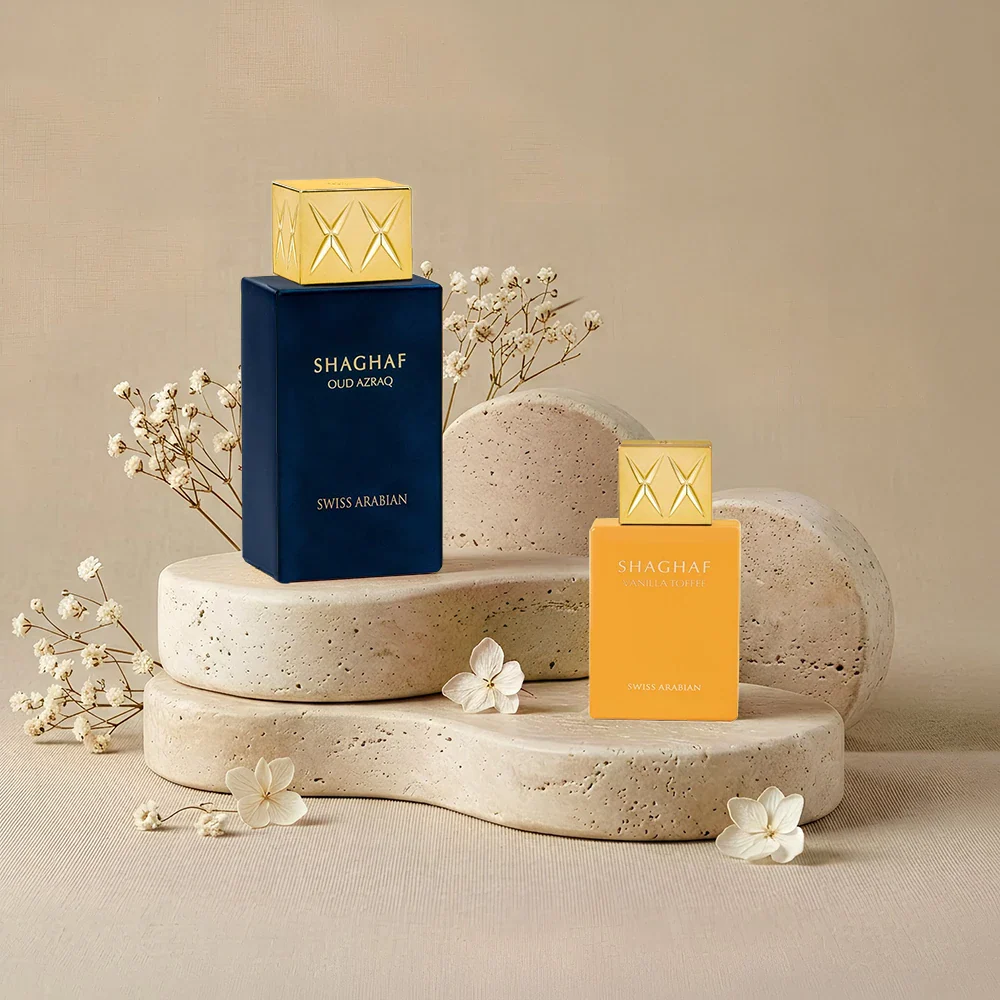 Shaghaf Oud Azraq is a golden amber oud fragrance, enriched with honey, spice, and Madagascar vanilla, layered with leather and patchouli to create a signature of quiet luxury. Paired with a 25ml Shaghaf Vanilla Toffee, where fresh citrus and lavender meet a warm ambered base, the composition softens into a balanced harmony of depth and brightness. Together, they offer a refined contrast, rich yet comforting, bold yet smooth, perfect for layering or wearing individually.